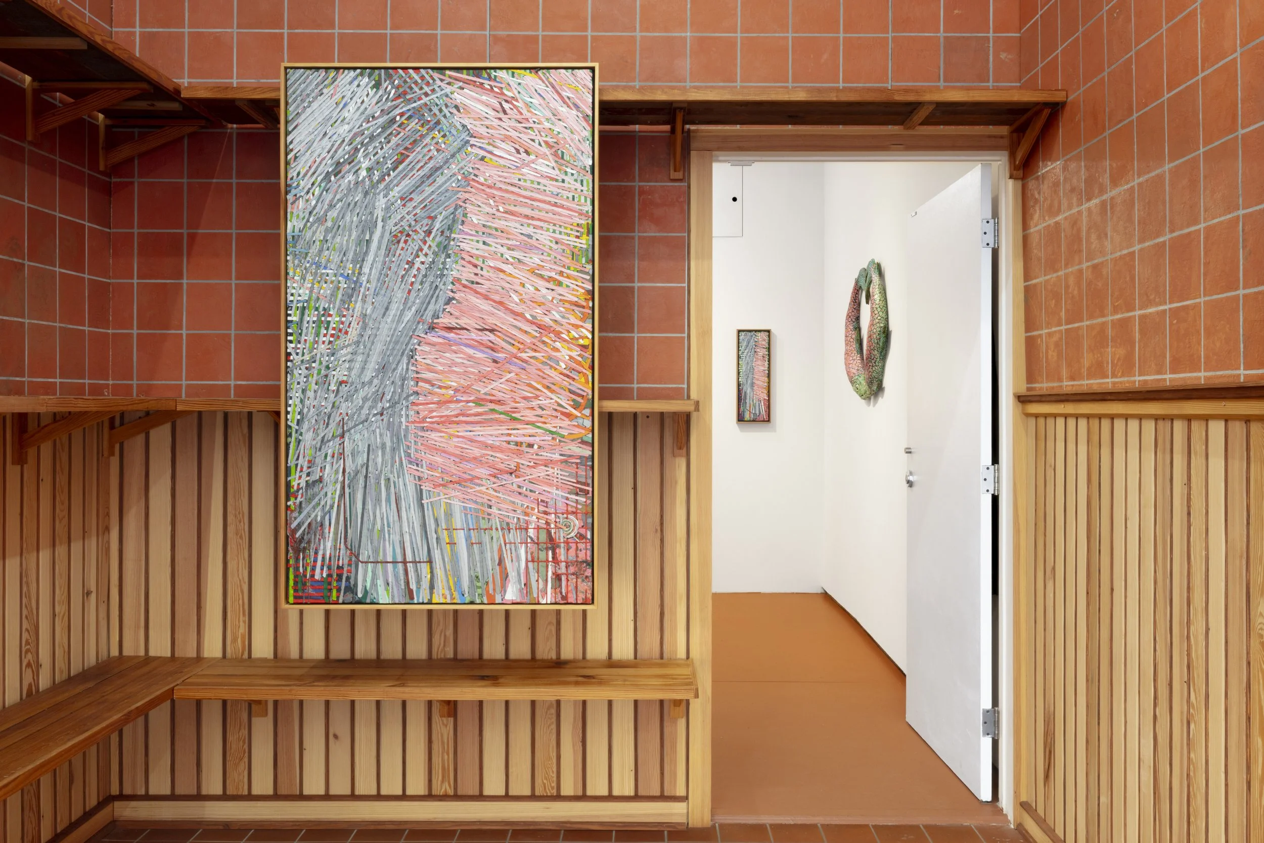 When Entrance was refurbished in 2021 the gallery underwent significant cosmetic changes, however, the original floors were preserved. Though uncommon in a gallery setting, the orange glazed tile is ubiquitous in any commercial kitchen or seafood processing facility in the Lower East Side and Chinatown. As part of the ambitious site-specific installation, Armstrong meticulously reconstructed the tiles using his signature encaustic technique. Moving and expanding the floor to the wall, the encaustic tiles are juxtaposed with hand-fabricated wood wainscoting and shelving, accompanying a series of eight new encaustic paintings. The installation acts as a backdrop for the abstract paintings, the smallest works of his career, now occupying Entrance’s rebuilt space.